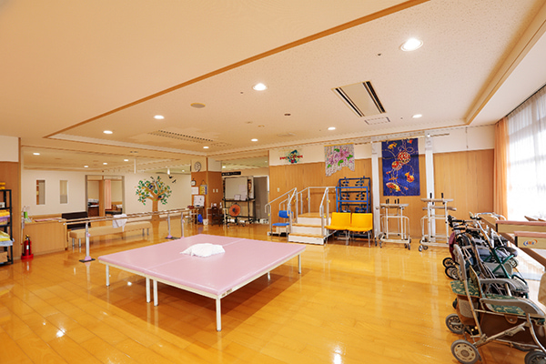 広々としたスペースと木の温もりを感じる内装で、利用される皆さまが安心してリハビリに取り組める環境を整えています